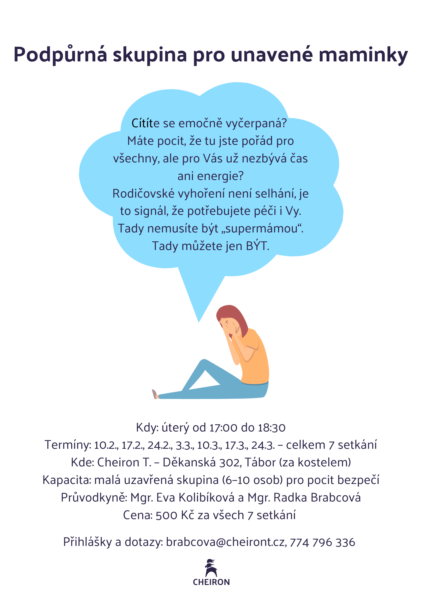 - přihlášky a dotazy na emailu: brabcova@cheiront.cz nebo na tel. čísle: 774 796 336